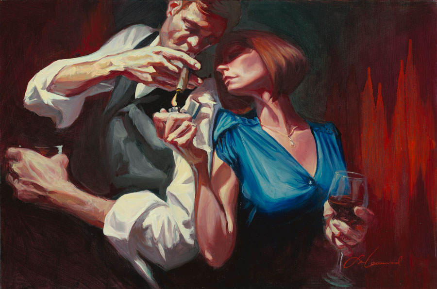 His work captures rich moods by combining the free brushwork of an expressive artist combined with the lighting and framing of a seasoned Hollywood cinematographer. Drawn to rugged and romantic film noir characters, Leonard merges technically brilliant figurative painting with a finely crafted cinematic atmosphere, creating snapshot moments full of narrative possibilities.