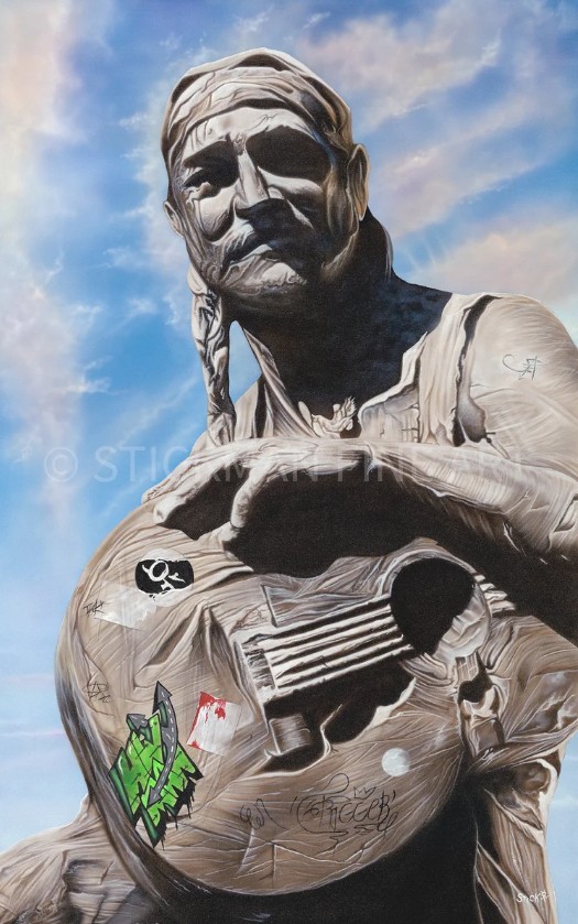 THE CONCEPT: The concept is to take a realistic portrait and juxtapose it with a background that expresses the feelings and emotions of the subject. This method also allows Stickman to explore other disciplines of art – many of his backgrounds will include abstract, expressionism, impressionism, realism, pop art, street art, surrealism and quite often a combination of these. This is where he gets to enjoy the artistic side of these pieces, while paying additional homage to some of his favorite visual artists.