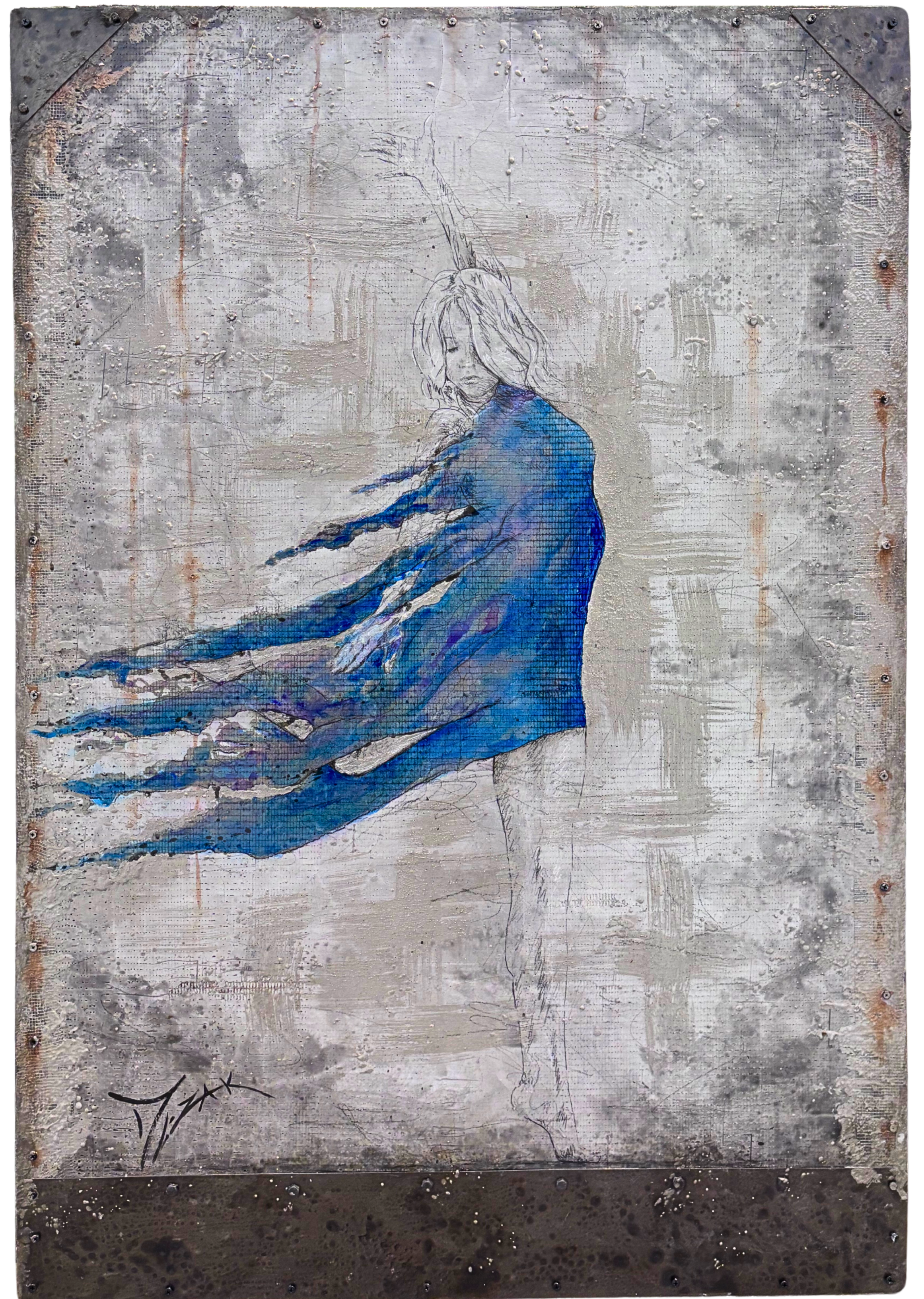 The materials with which Mezak works—reclaimed wood, concrete slabs, metal, nails, screws, gunpowder—are more familiar to construction sites but are ultimately transformed into abstract, painterly gestures of pure texture. A devoted surfer who regularly tests prototype boards, Mezak’s connection with the unpredictability and power of the ocean translates into his artistic practice. The exchange of energy, whether it be using power tools or a palette knife, is what unites Mezak’s personal experience with his surroundings. Mezak has been recognized for his collaborations with Collector’s Editions and Disney Fine Art, and he has exhibited nationally over the years. He is currently expanding his abstract, textural work.
