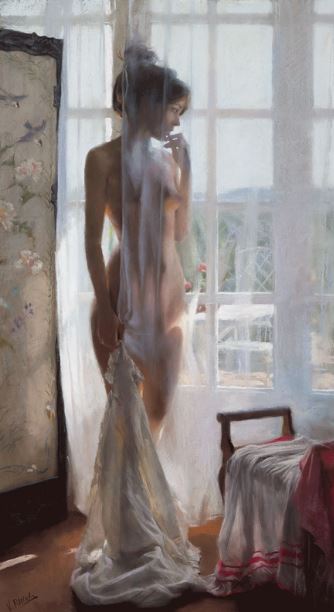 From a very early age, I was attracted to the inner world of women, it’s a kind of mystery that makes me feel a great fascination. I don’t believe in art which is too conceptual nor in virtuosity. Art without emotional communication is very respectable but I’m not interested in this. The fact that iconographically my paintings have a marked “retro”or anachronistic flavour, it is not due to a desire to revive old times but to the fact that the functional clothing style imposed since long time ago until now, is not at all attractive to me from a plastic point of view.